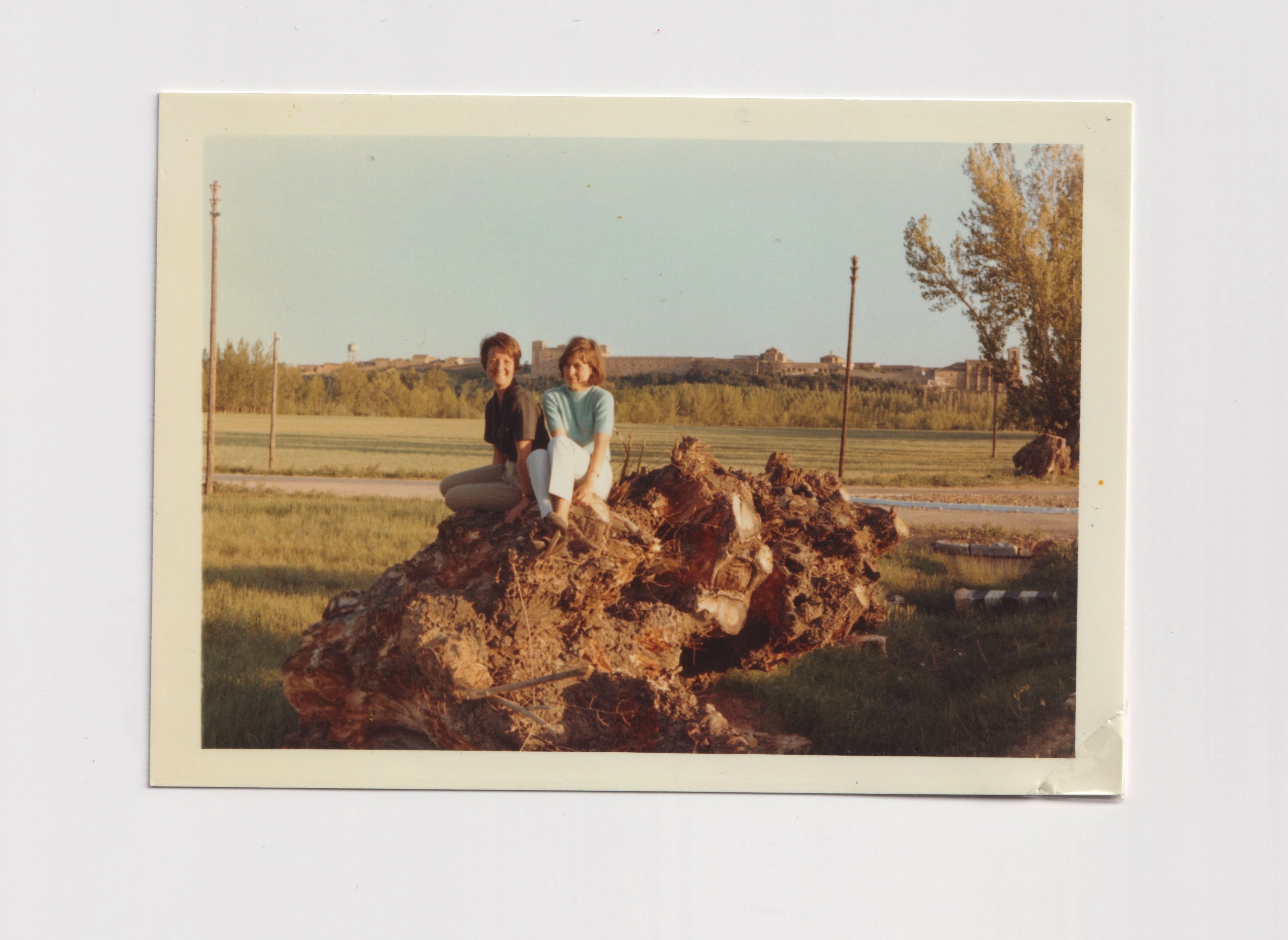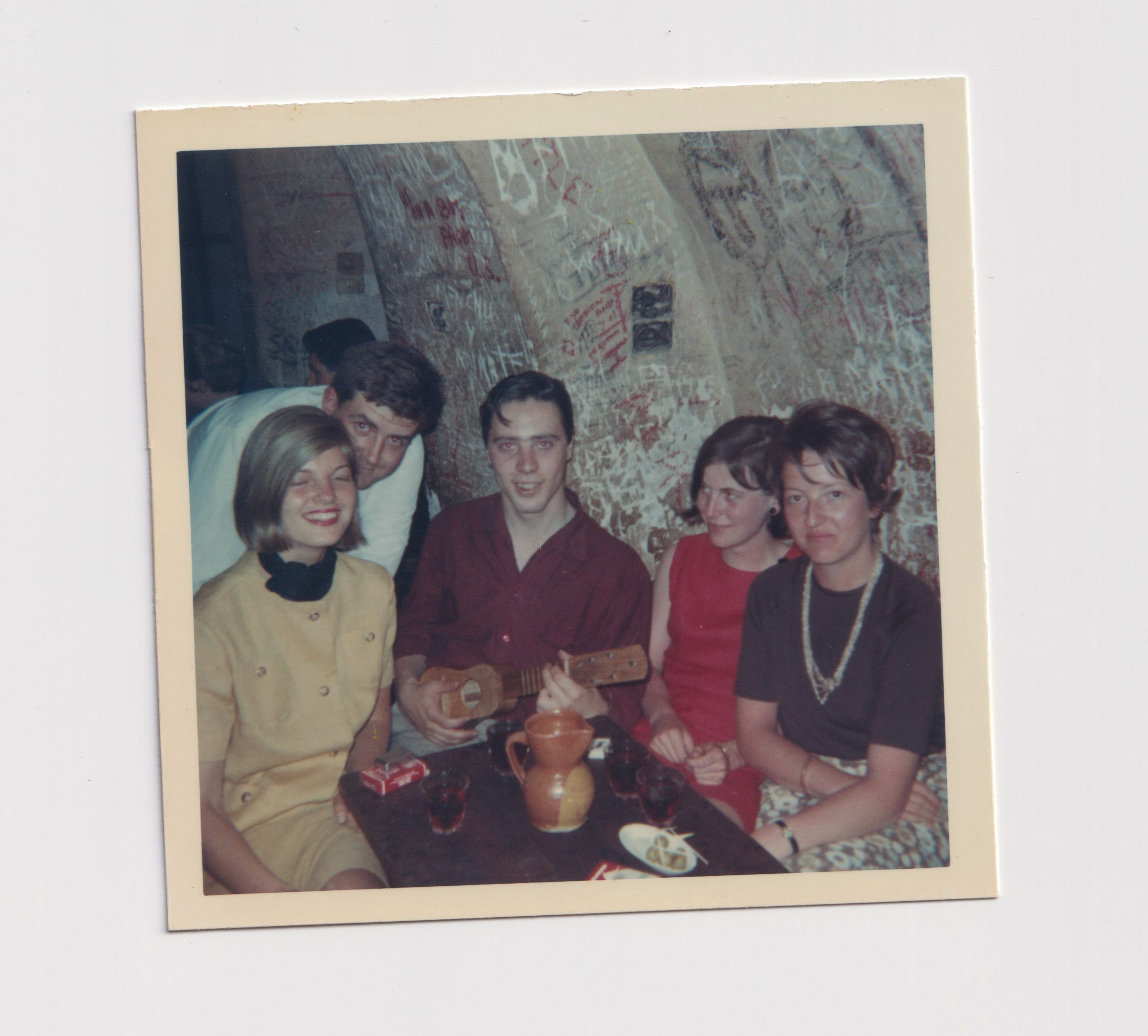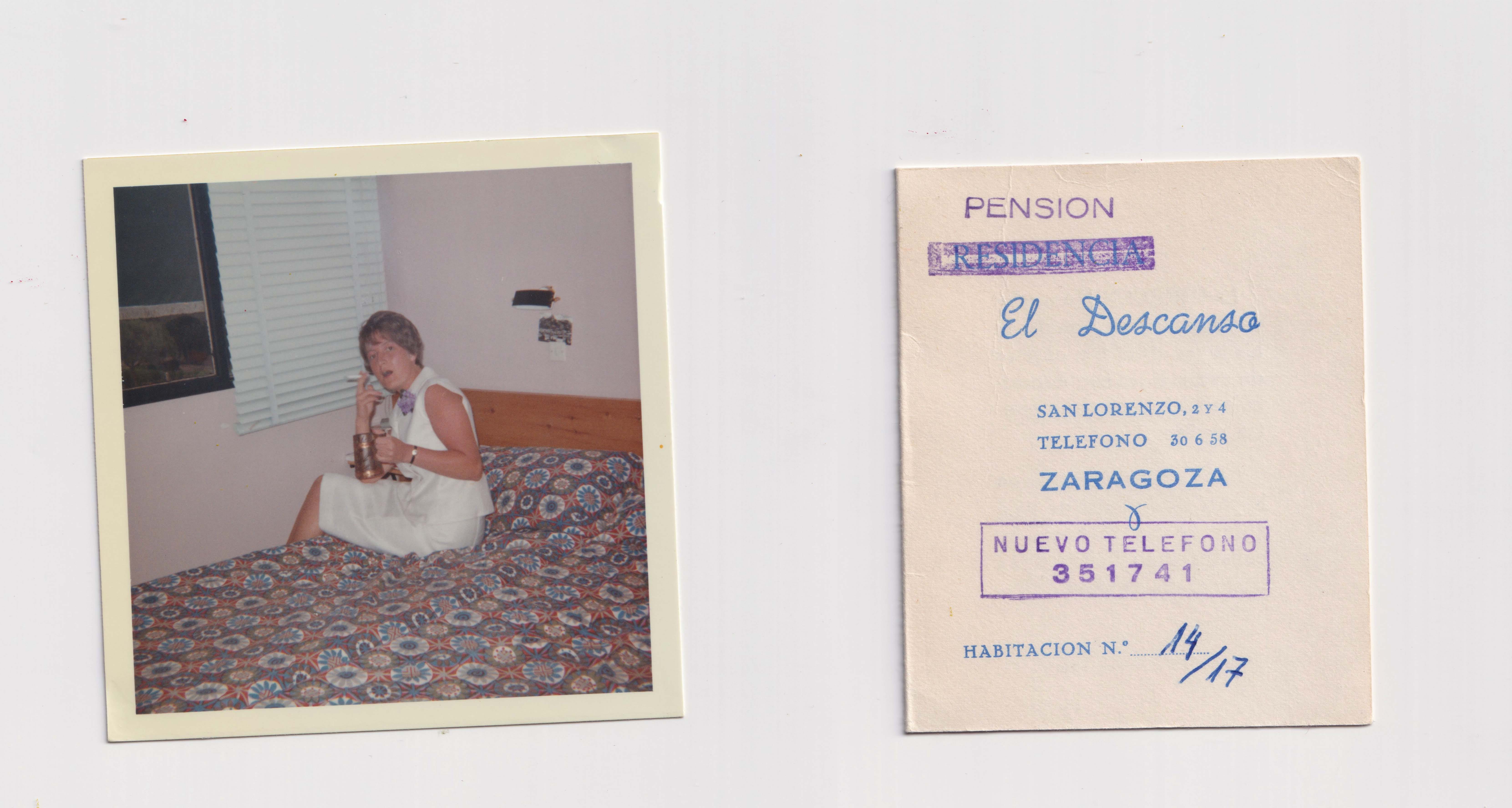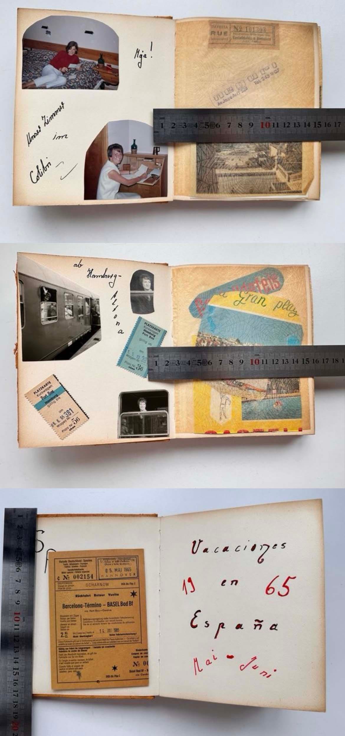 Vi algunas de las fotos que adjuntaba mi amigo y antes de llegar a la última, lo compré. Llegó cinco días después y las fotos de las fotos no le hacían justicia a las fotos ni al álbum (que se parece un poco al Necronomicrón de Evil Dead). En él aparecen fotos, tickets, servilletas y recortes del viaje que dos amigas *suspiros* hicieron por España en 1965 durante los meses de mayo y junio. Después de diez días de viaje, llegaron a Barcelona desde Hannover un 15 de mayo. Estuvieron en: Castelldefels, Sitges, Tarragona, Calatayud, Zaragoza, La Almunia, Madrid, Boceguillas, Burgos, Santander, Bilbao, San Sebastián, Vitoria, Tudela y Aduna. Hay una servilleta de una churrería llamada La Palma en Lleida, una cafetería de Zaragoza llamada Gambrinos y una pensión llamada… El Descanso. En 1965 la plaza de La Cibeles era más bonita que ahora y en un sitio llamado Pizzeria Napoletana conocieron a Xavier y a Joaquim, unos chicos que se hacían llamar «Los Canarios». La foto que acompaña esta entrada del diario me encanta porque una de ellas tiene la misma cara de asco que tendría yo si estuviera sentada a la mesa con un tío que toca la guitarra: